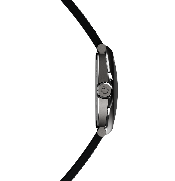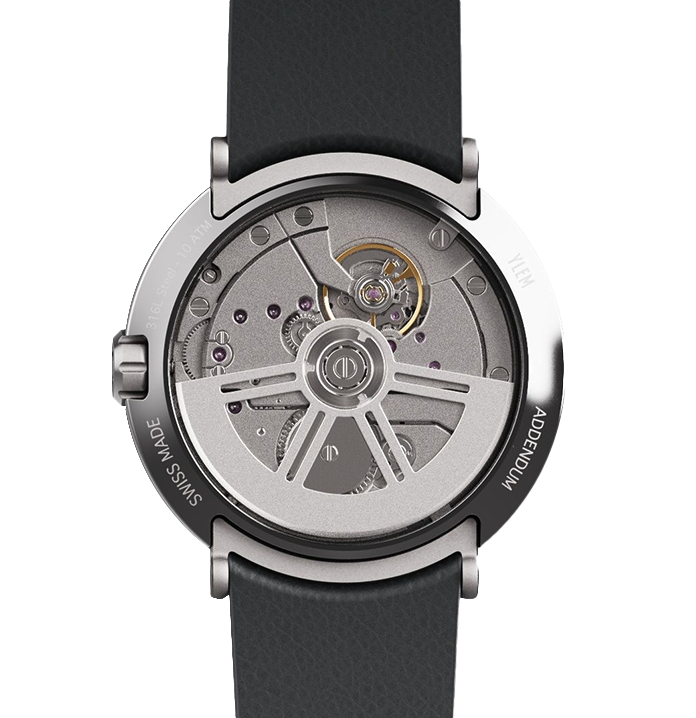 The animating feature of the Addendum is the integration of the crown seamlessly into the case, with minimal interruption to case symmetry. The Addendum hugs the wrist with its modern take on scroll lugs, helping to create an ergonomic and modern watch that is large and legible yet elegant on the wrist. The connection of the bezel to the case middle flows downward, mimicing the wearer’s wrist and easing the transition from case to strap. The distinctive bezel shape is mirrored with the hour index font, designed specifically for the Addendum. The Addendum carves its own space amongst watch genres with a practical elegance that is instantly recognizable.